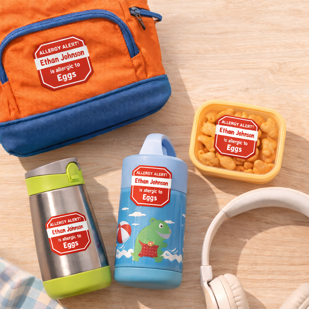 Bold and easy-to-read allergy alert labels personalized with your child’s name—perfect for daycare, school, and food containers.