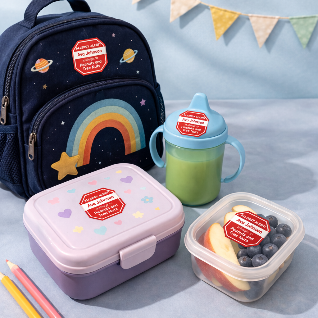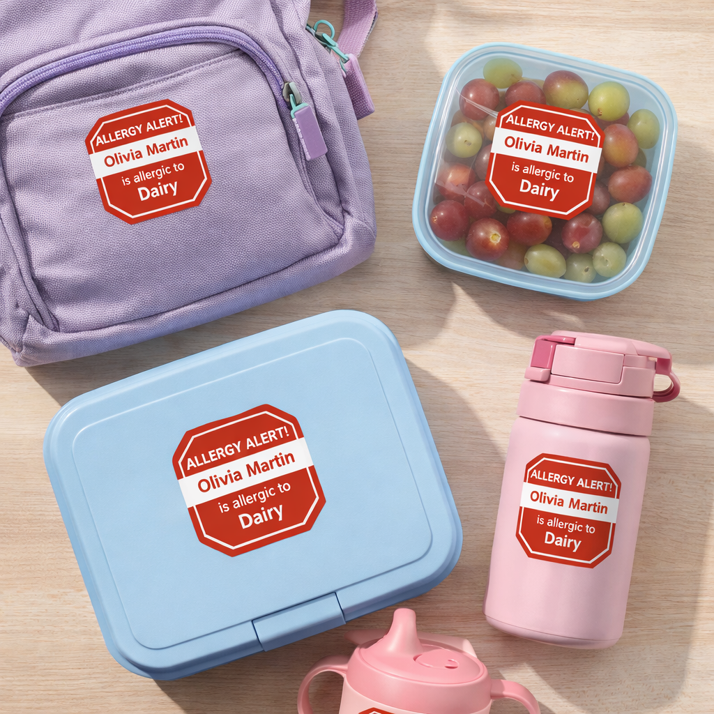 These labels are specially created to stand out instantly, helping teachers, caregivers, and staff quickly recognize your child’s allergy needs. Each label can be personalized with your child’s name and features a bold allergy alert design for maximum visibility.